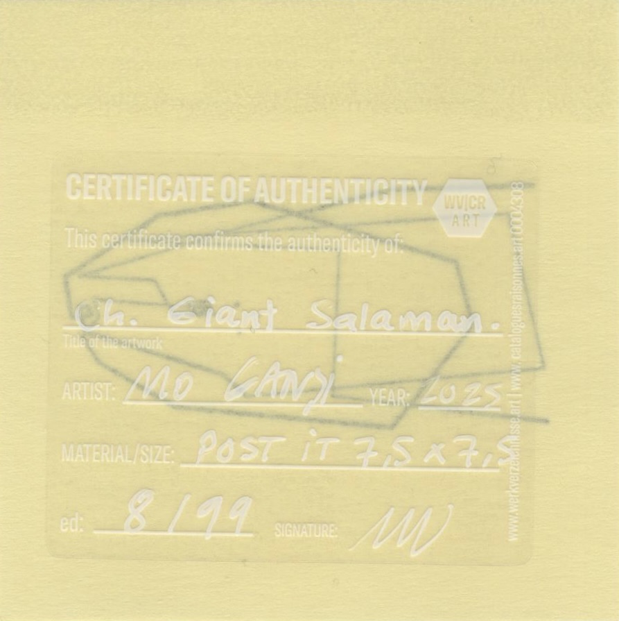 Mo Ganji’s single line encounters the Chinese giant salamander — a massive, fully aquatic amphibian — as a gesture seeking the essence beneath appearance. The continuous line provides only a pared-down indication of form, suggesting a presence that could be read as salamander yet remains open to multiple interpretations. In this deliberate simplicity, the being is allowed to surface before the structures of naming take hold.