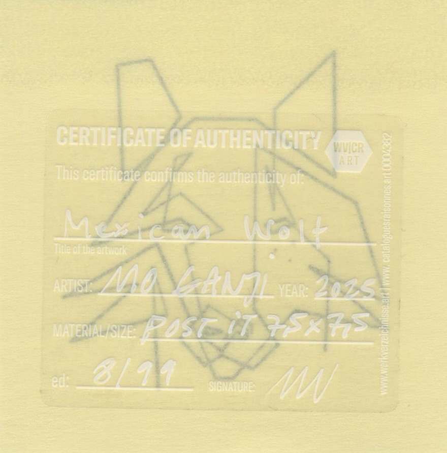 Mo Ganji’s single line engages the Mexican wolf — a medium-sized canid adapted to forests, grasslands and mountainous landscapes — by allowing its inner coherence to surface without emphasis on ferocity, hierarchy or myth. The continuous line holds a distilled core of presence, enough to suggest a being while remaining open to meanings beyond the category of “wolf.” In this exposure of the essential, form appears before fear or symbolism claims authority.