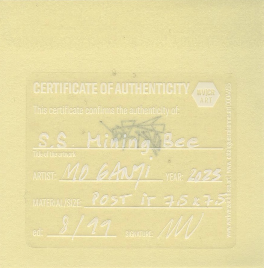 Mo Ganji turns his attention to the Small scabious mining bee — a solitary wild bee closely tied to open grasslands and flowering meadows — by letting the single line move toward essence rather than activity or ecological role. The line condenses the being into a reduced coherence, setting aside motion, pollination and scale so that presence can surface without explanation. In Ganji’s understanding, the line does not belong to the bee alone; it remains open, reminding us that every figure is also a human concept provisionally placed upon a living process.