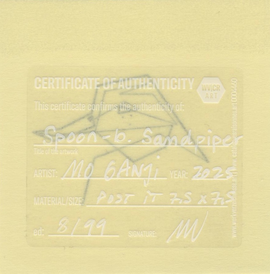 Mo Ganji turns toward the spoon-billed sandpiper — a small migratory shorebird breeding in the Arctic and wintering along Asian coastlines — by letting the single line move toward inner coherence rather than adaptation or anomaly. The line condenses the being into a reduced presence, setting aside beak shape, movement and fragility so that what emerges is not a description, but a core. In Ganji’s thinking, the line does not belong exclusively to this bird; it remains open, reminding us that every form is also a human concept, temporarily named.