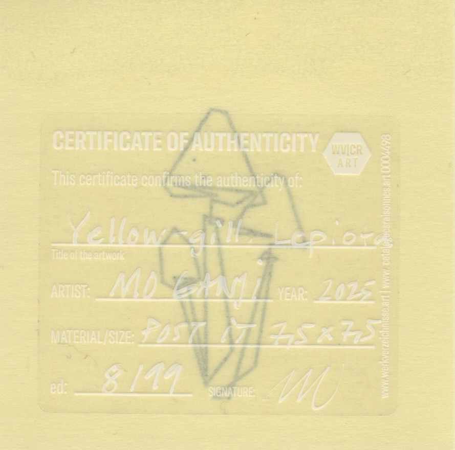 Mo Ganji turns toward the yellow-gilled lepiota — a small saprotrophic fungus emerging briefly from forest soils — by letting the single line move toward essence rather than appearance or rarity. The line condenses the being into a reduced coherence, setting aside cap, gills and ephemerality so that presence can surface without depiction. In Ganji’s understanding, the line does not belong to the fungus alone; it remains open, reminding us that every form is also a human concept provisionally placed upon a living process.